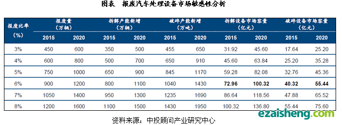 1、汽车拆解行业产值预测 按照2013年的保有量数据口径,1.3亿辆民用汽车中,小型载客汽车和轻型载货汽车占主流,分别占据79%和10.26%的比例。按照单车重量进行加权平均估算,每辆车平均重量为2.23吨。以目前资源及再利用零部件价格计算,单辆车收入约4000元/辆,到2020年,我国报废汽车拆解产值将达到400-500亿元规模,中投顾问发布的《2016-2020年中国报废汽车回收拆解行业深度调研及投资前景预测报告》认为未来待五大总成再制造放开,报废汽车拆解市场空间将达到千亿级。  2、汽车拆解设备市场预测