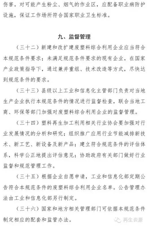 近日,工信部发布了《废塑料综合利用行业规范条件》及《废塑料综合利用行业规范条件公告管理暂行办法》。 中华人民共和国工业和信息部公告 2015年第81号 为贯彻落实《循环经济促进法》,规范废塑料资源综合利用行业发展秩序,促进企业优化升级,加强环境保护,提高资源综合利用技术和管理水平,引导行业健康持续发展,我部制定了《废塑料综合利用行业规范条件》、《废塑料综合利用行业规范条件公告管理暂行办法》,现予公告。 各有关部门和省、自治区、直辖市在项目投资核准(备案)管理、国土资源管理、环境影响评价、信贷融资、安全监管等工作中应以本规范条件为依据。